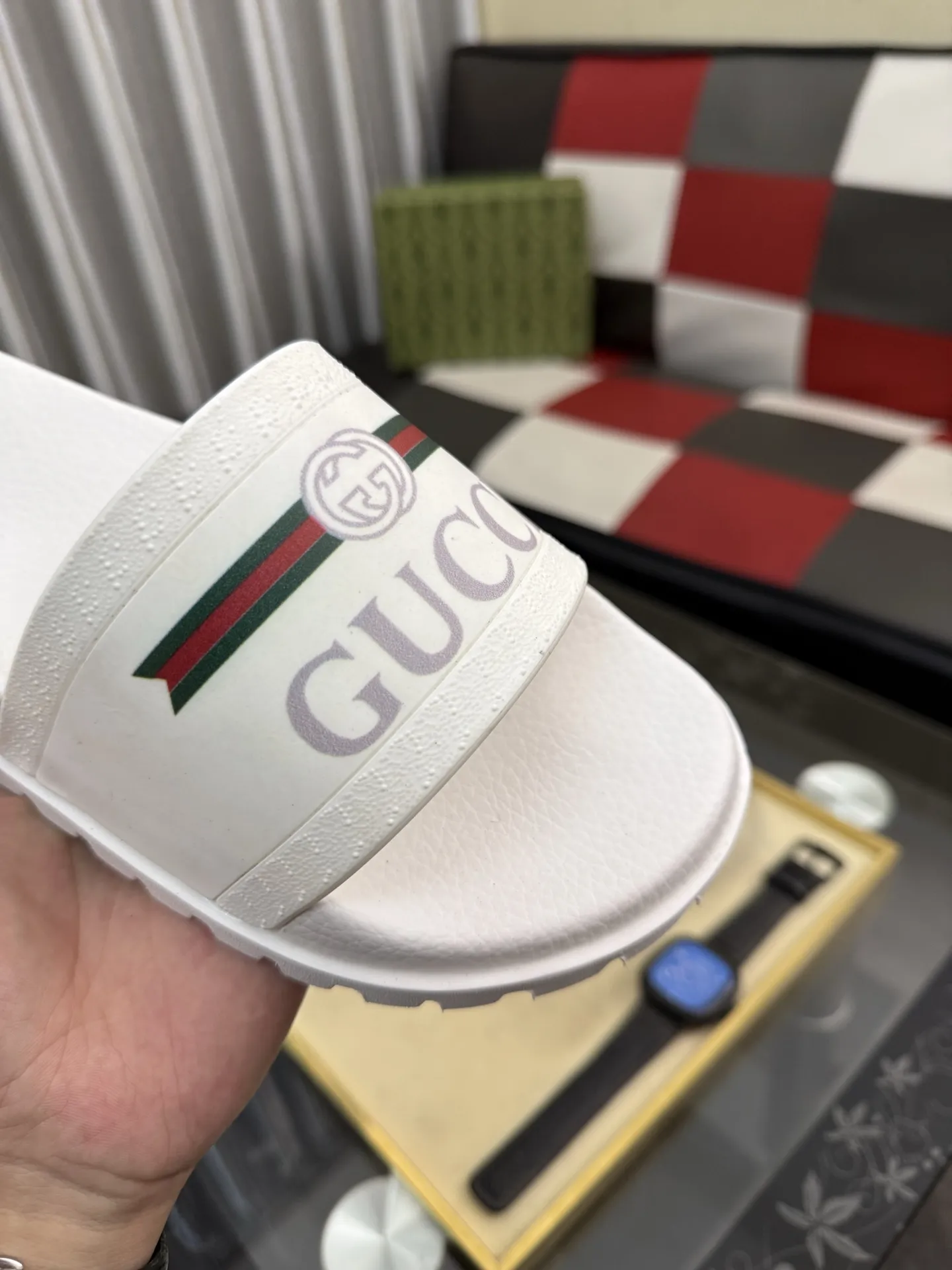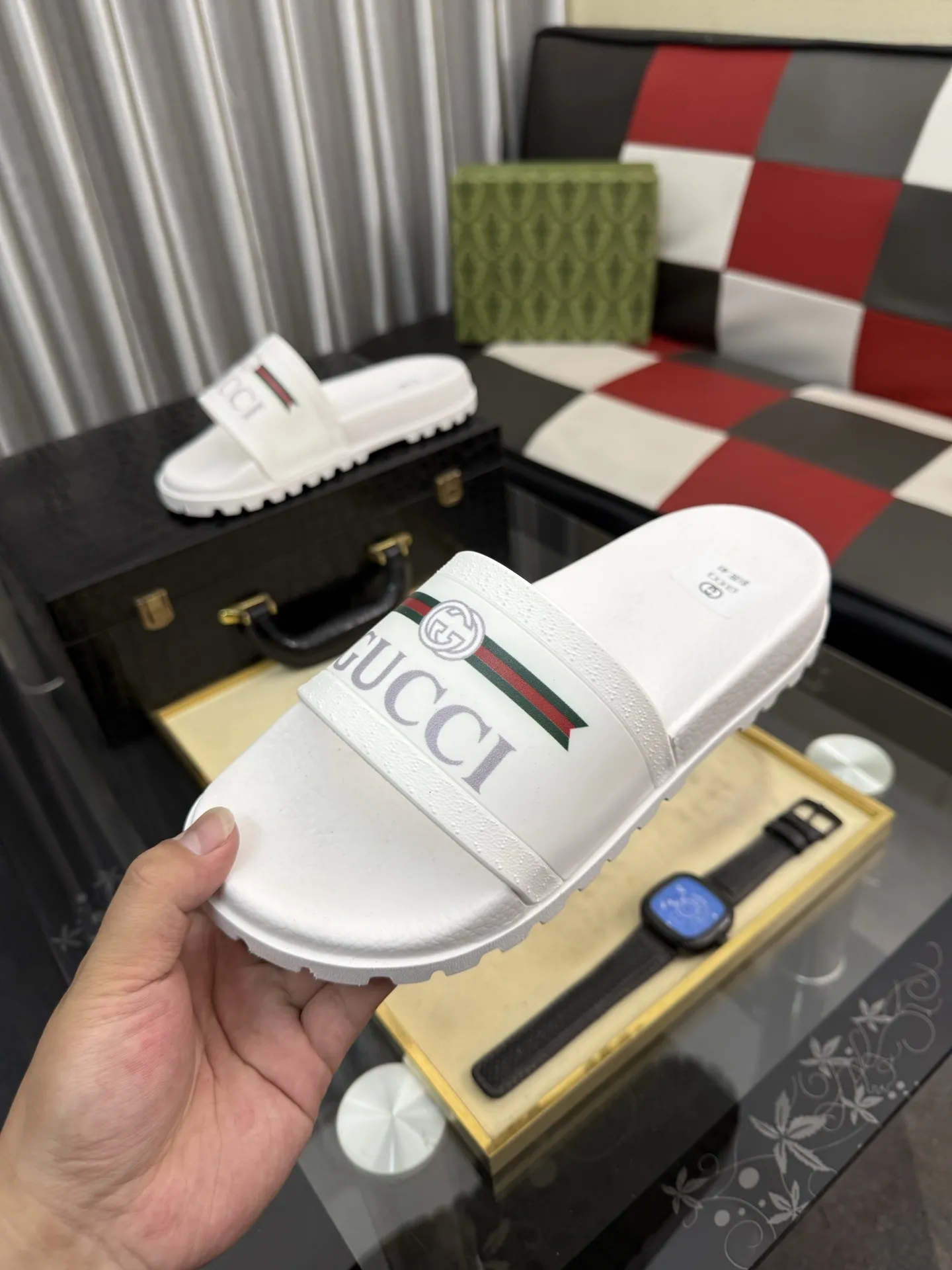Wholeale cheap replica Gucci Slippers For Men #1434947 prices $48.00 USD online, outlet Gender MenSize US 4=EUR(38), US 5=EUR(39), US 6=EUR(40), US 7=EUR(41), US 8=EUR(42), US 9=EUR(43), US 10=EUR(44)! Wholesale new arrivals cheap fake Gucci Slippers enjoy free shipping and 66%-OFF with best quality! The hot on sale style Gucci Slippers For Men #1434947.